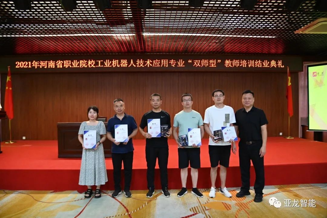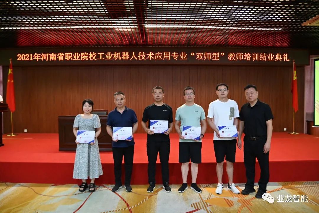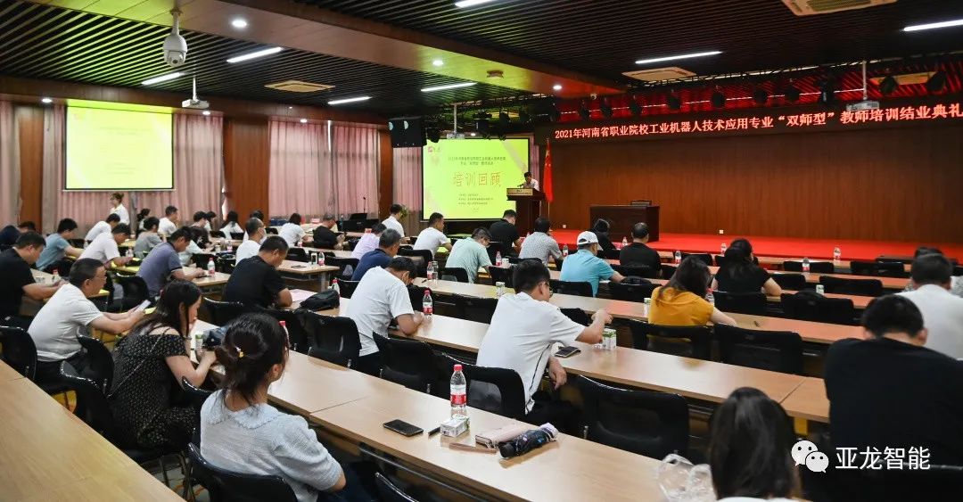 2021年8月3日上午,“2021年河南省職業教育“雙師型”教師工業機器人技術應用專業師資培訓班”結業儀式在亞龍智能五樓報告廳順利舉行。經過為期20天的系統學習,46名來自河南省職業院校相關專業的專任教師圓滿完成培訓任務、順利結業。